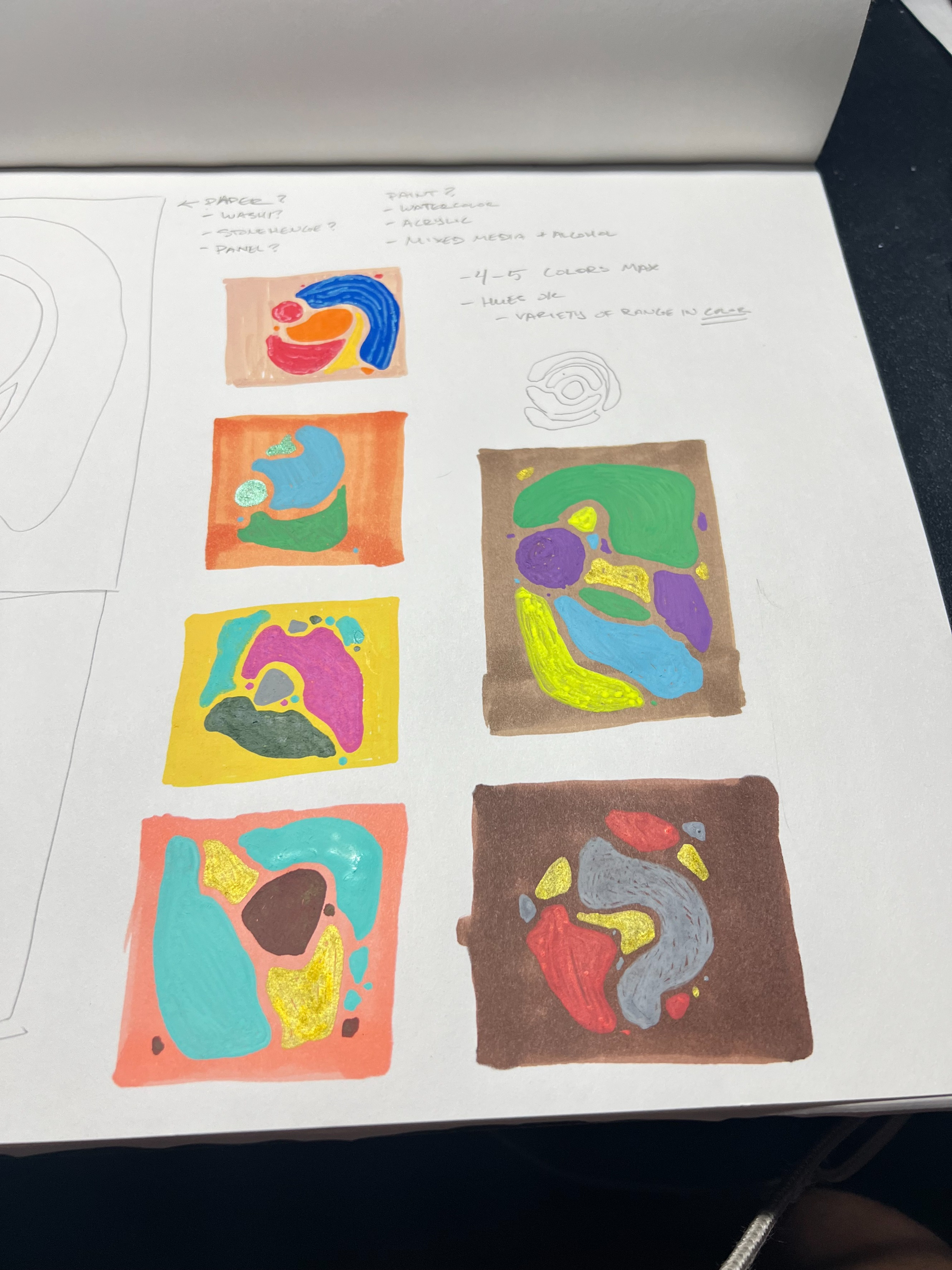 Some of the early sketches feature dynamic clusters of shape combinations, often not fully enclosed, leaving the eye to fill in the gaps. Others play with motion through minimal contrast, using color fields that pulse with softness or sudden direction.